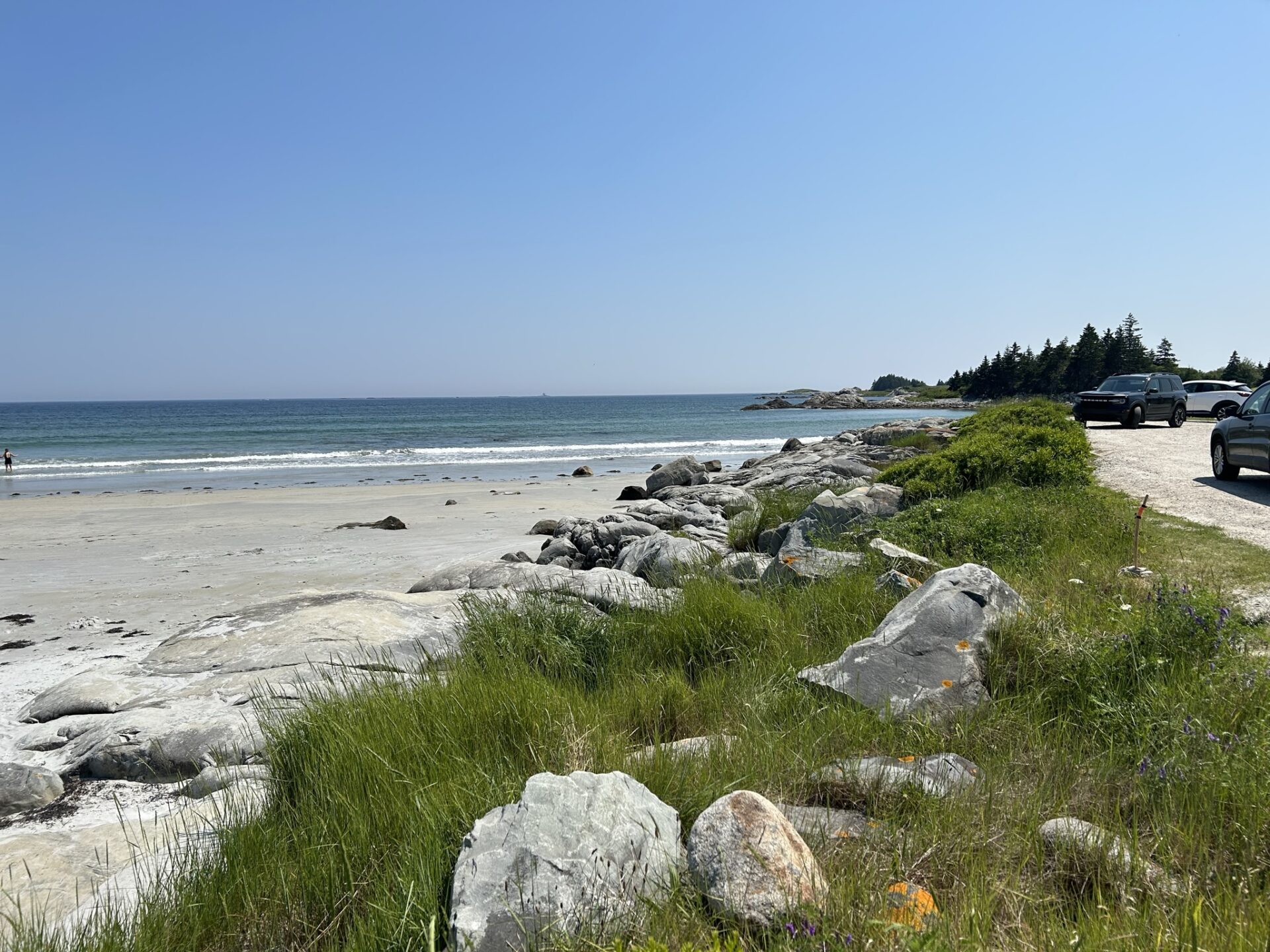 La seule autre plage avec un score de 8/10 sera la suivante : la Crow Neck Beach à Baccaro, qui est longue à marcher et nous avons eu la visite d’un phoque en bonus. Après notre souper en van au phare tout près de Baccaro, nous tenterons une dernière visite de plage à Sand Hills Day-Use Provincial Park. Nous avions à marcher un sentier dans un genre de boisé au soleil déclinant et aux maringouins envahissants… on a changé de cap assez vite sans avoir vu cette plage qui restera une « non cotée».