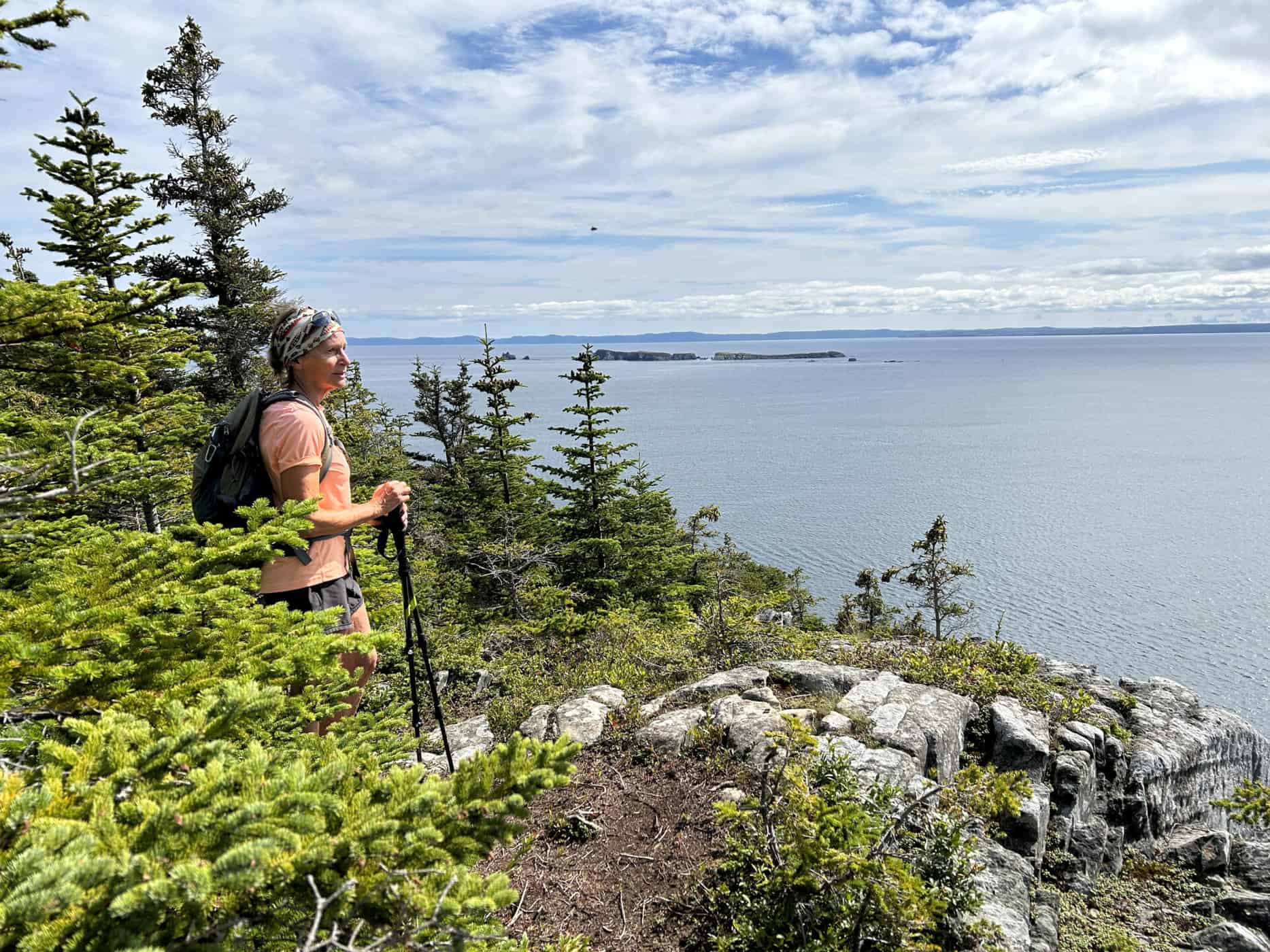 Nous commencerons par une belle randonnée de 8 km, la Pirates Path, un sous-bois avec son tapis de mousse verte garni d’ouvertures qui nous amenaient sur des cotes élevées avec vue sur l’océan. Après quelques kilomètres, nous débouchons sur un chemin ouvert qui nous mènera sur un cap tout en hauteur à couper le souffle. Mais le meilleur dans tout ça, et ça doit rester entre nous, ce sentier était bordé de bleuets. On s’arrêtait à tous moments en découvrant une talle mieux garnie que la précédente.