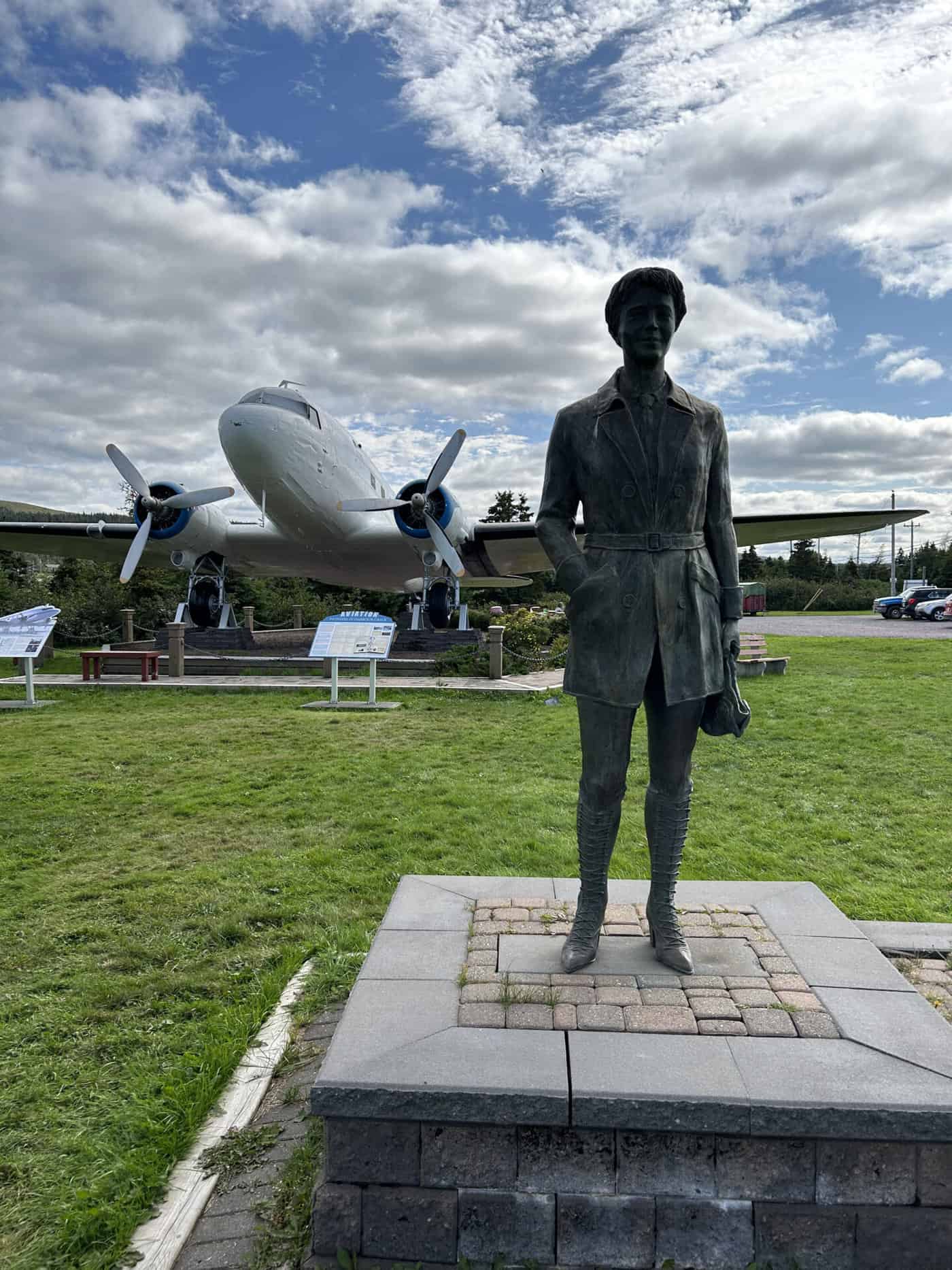Suite à la randonnée, comme nous sommes dans le secteur de la ville de Harbour Grace, la route nous amène vers un grand parc aménagé en l’honneur de la première femme pilote à voler en solo pour faire la traversée de l’Atlantique. Amélia Earhart a sa statue dans ce parc ainsi qu’un avion du type qu’elle a conduit pour cet exploit. Le départ se faisait de Harbour Grace. De l’autre côté de ce parc, une épave échouée dans le cours d’eau et … au bout d’une jetée de pierre, un aigle. Après plusieurs minutes à l’observer, il prend son envol jusqu’au rafiot pour se percher sur la cabine. Majestueux!
