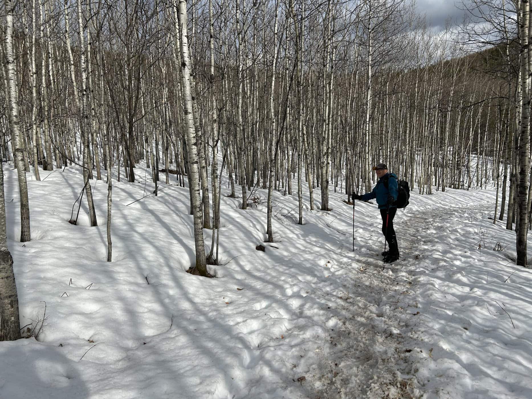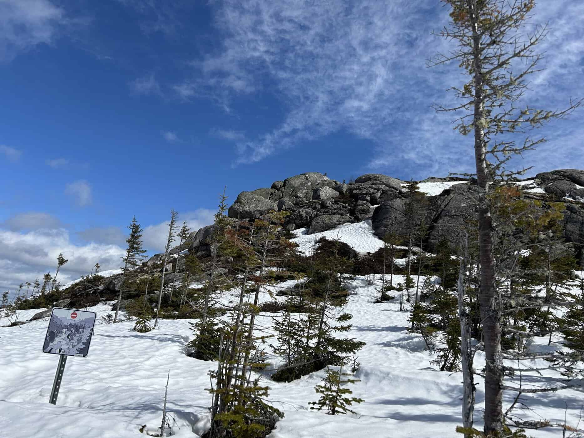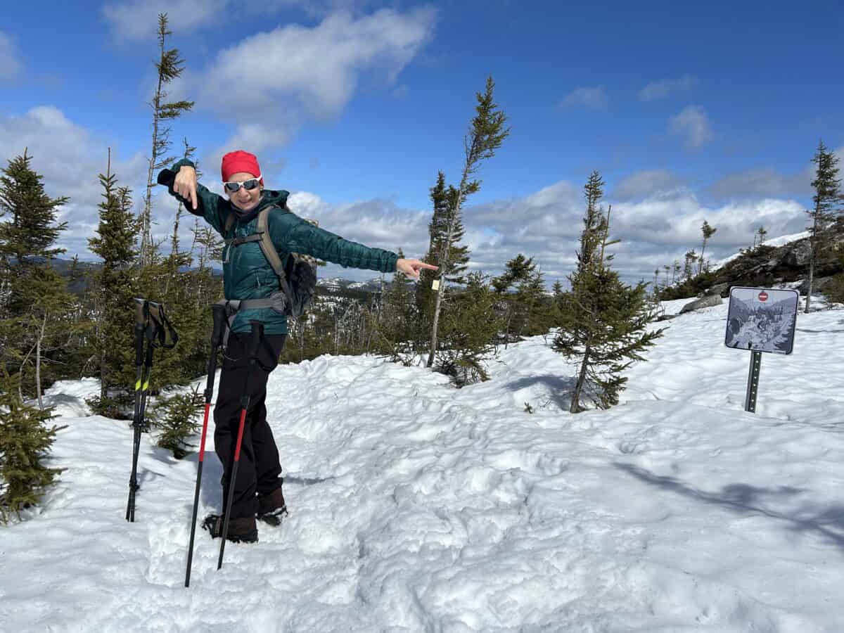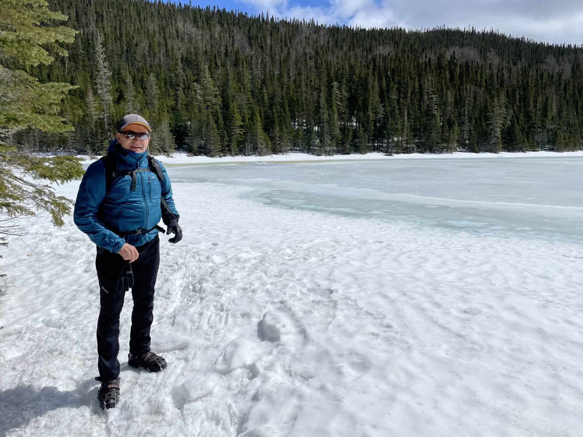 Une boucle de 12.6 km qui cette fois-ci nous a donné du fil à retordre. Les sentiers de raquettes que nous empruntons habituellement en crampons sont normalement assez tapés pour ne pas que l’on ne s’enfonce dans la neige. Ce qui n’était pas du tout le cas en ce 14 avril où la neige était vraiment molle et mouillée. Nous devions faire très attention à chaque pas tout au long de la montée et jusqu’au Mont du Lac des Cygnes qui se situe au km 9 sur un total de 12.6 km. Cela nous aura pris un peu plus de 6 heures pour faire le trajet que nous parcourons habituellement en moins de 4 heures.
