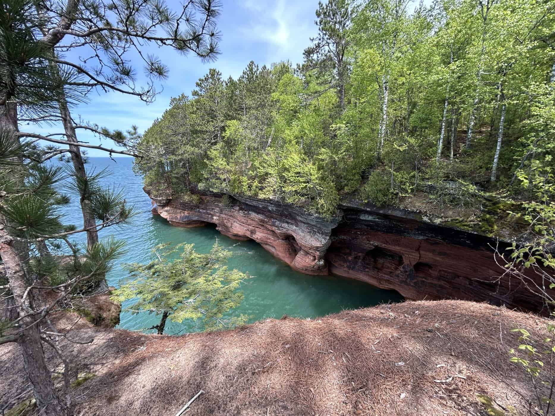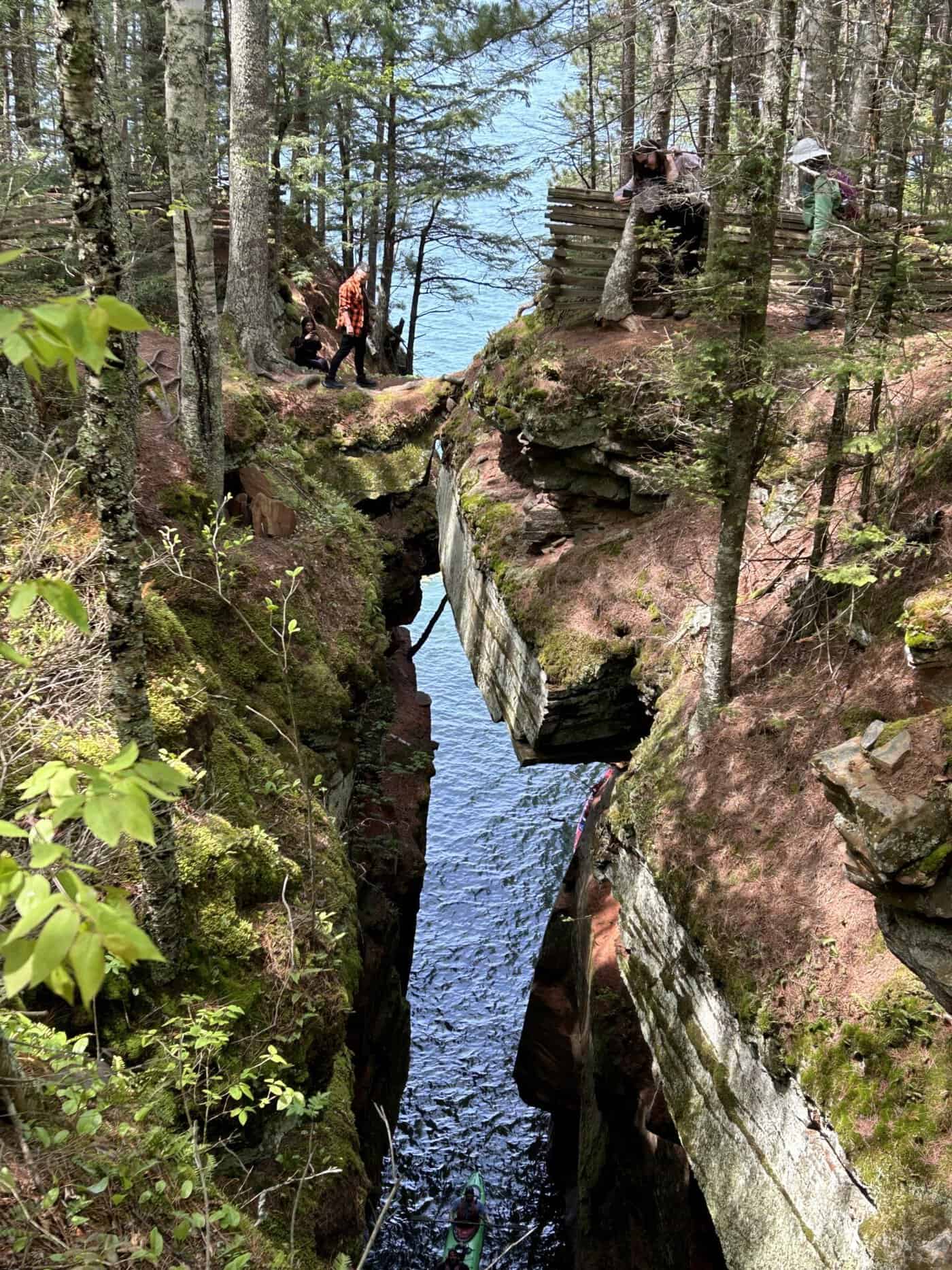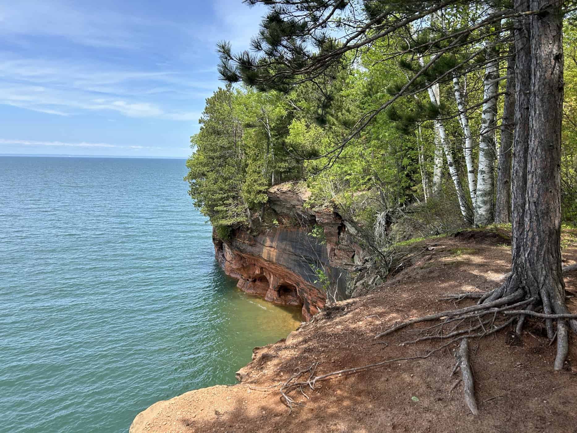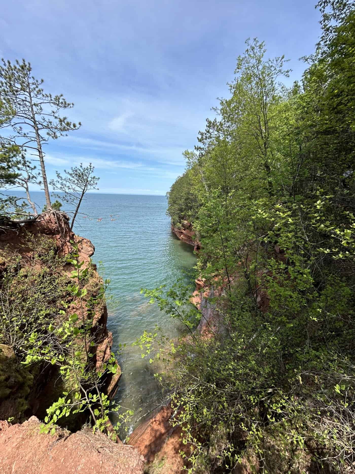 Alors une gentille dame qui donnait de l’information sur ce National Lakeshore, nous suggère de faire les « Mainland Sea Caves » par le haut. Une randonnée qui se faisait en partie sur de longs trottoirs de bois puis en suivant le bord des falaises. Nous pouvions apercevoir certaines des grottes, voir et entendre les vagues qui s’y engouffraient, observer de haut les kayaks qui les sillonnaient. Nous n’avions pas la même vision de ces magnifiques grottes, mais nous avons apprécié cette belle solution de rechange!