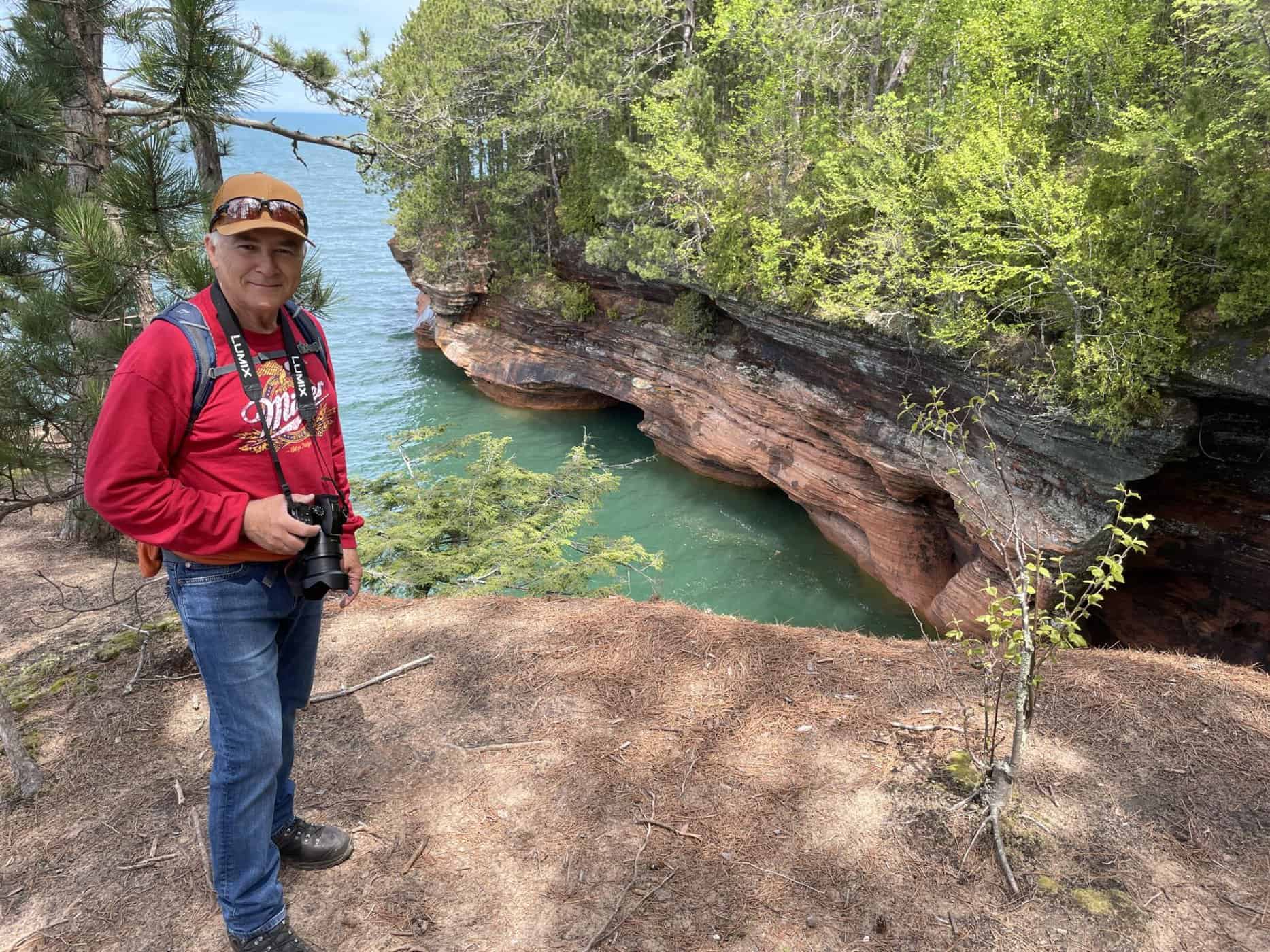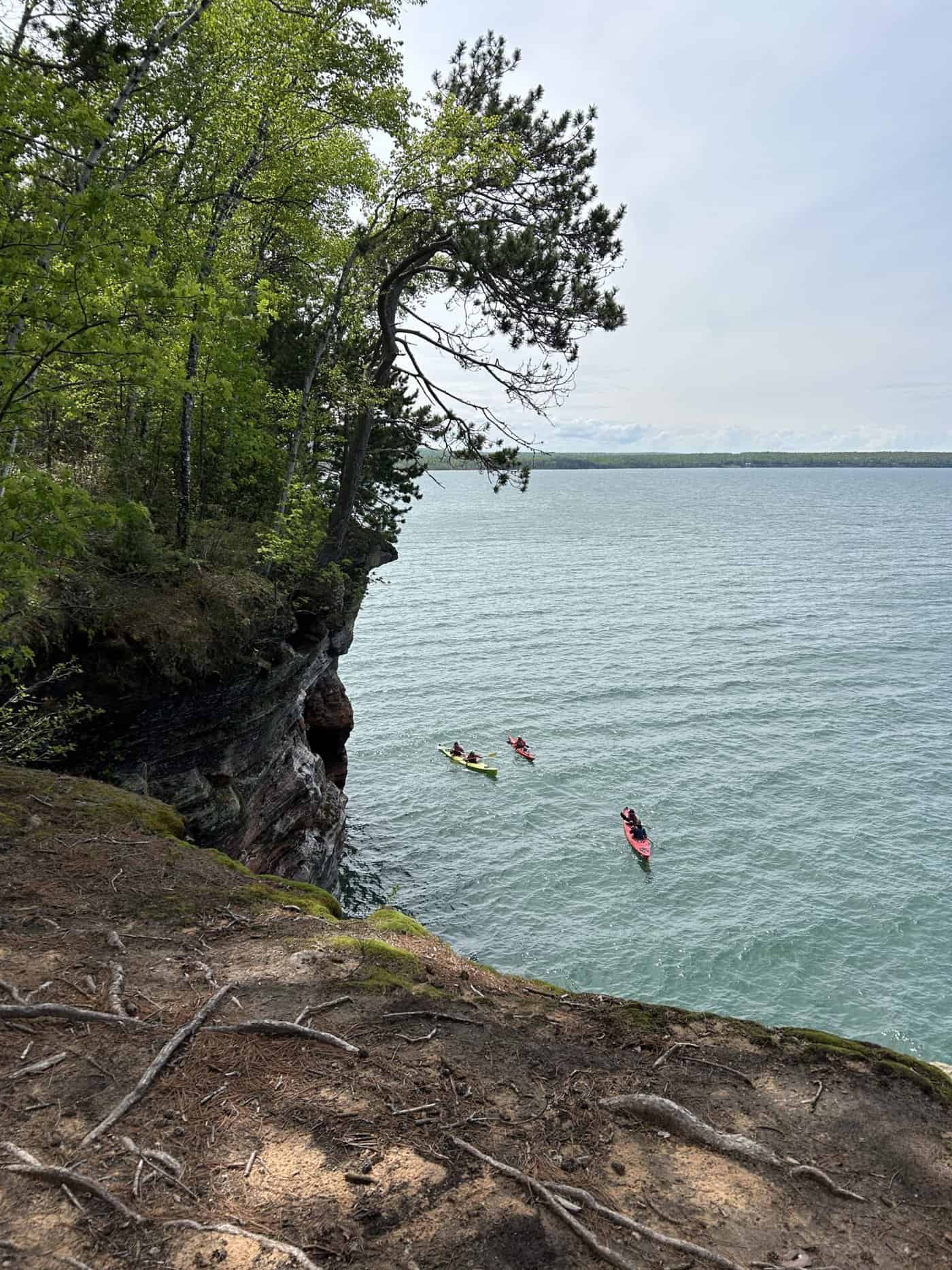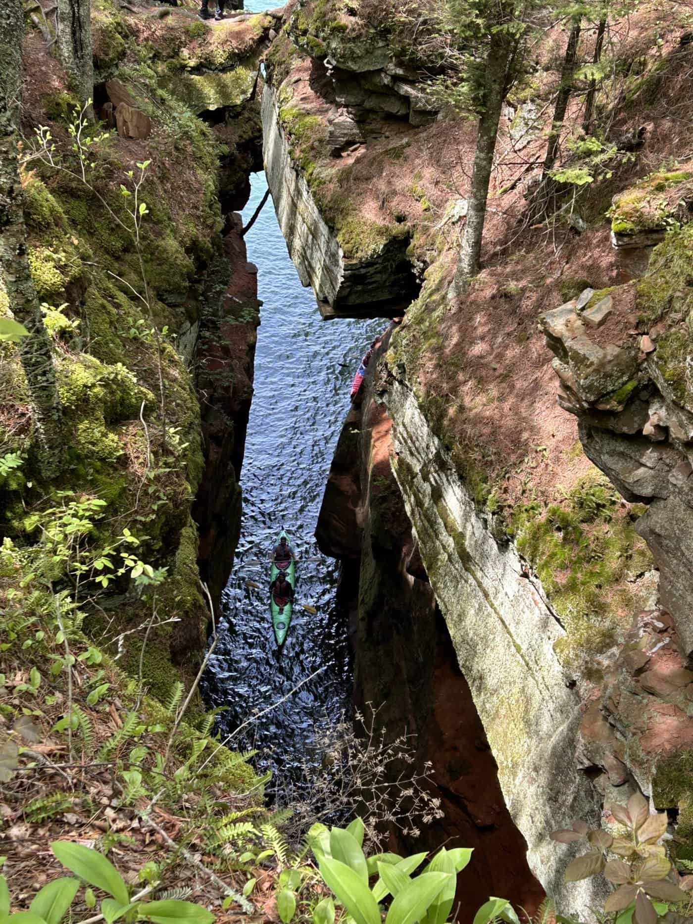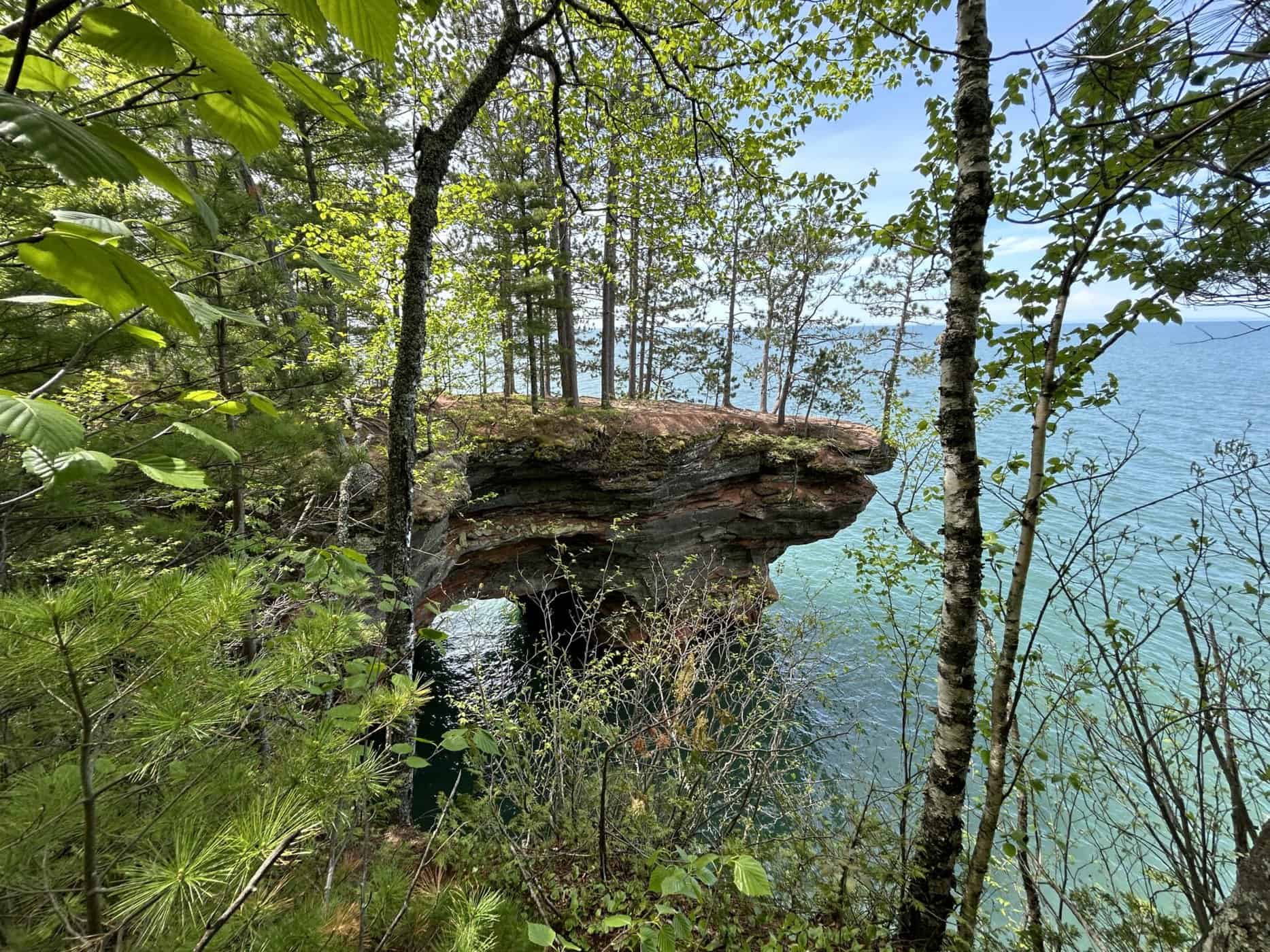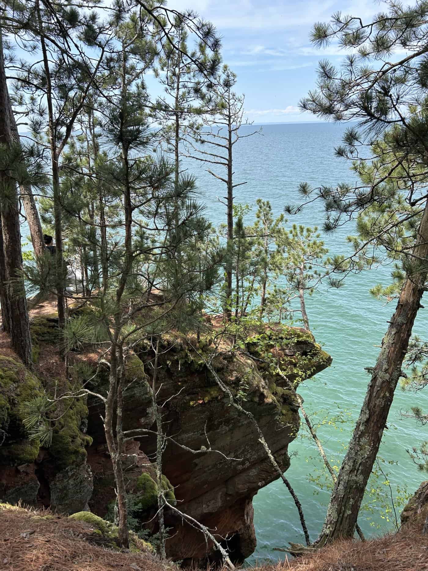 Alors une gentille dame qui donnait de l’information sur ce National Lakeshore, nous suggère de faire les « Mainland Sea Caves » par le haut. Une randonnée qui se faisait en partie sur de longs trottoirs de bois puis en suivant le bord des falaises. Nous pouvions apercevoir certaines des grottes, voir et entendre les vagues qui s’y engouffraient, observer de haut les kayaks qui les sillonnaient. Nous n’avions pas la même vision de ces magnifiques grottes, mais nous avons apprécié cette belle solution de rechange!