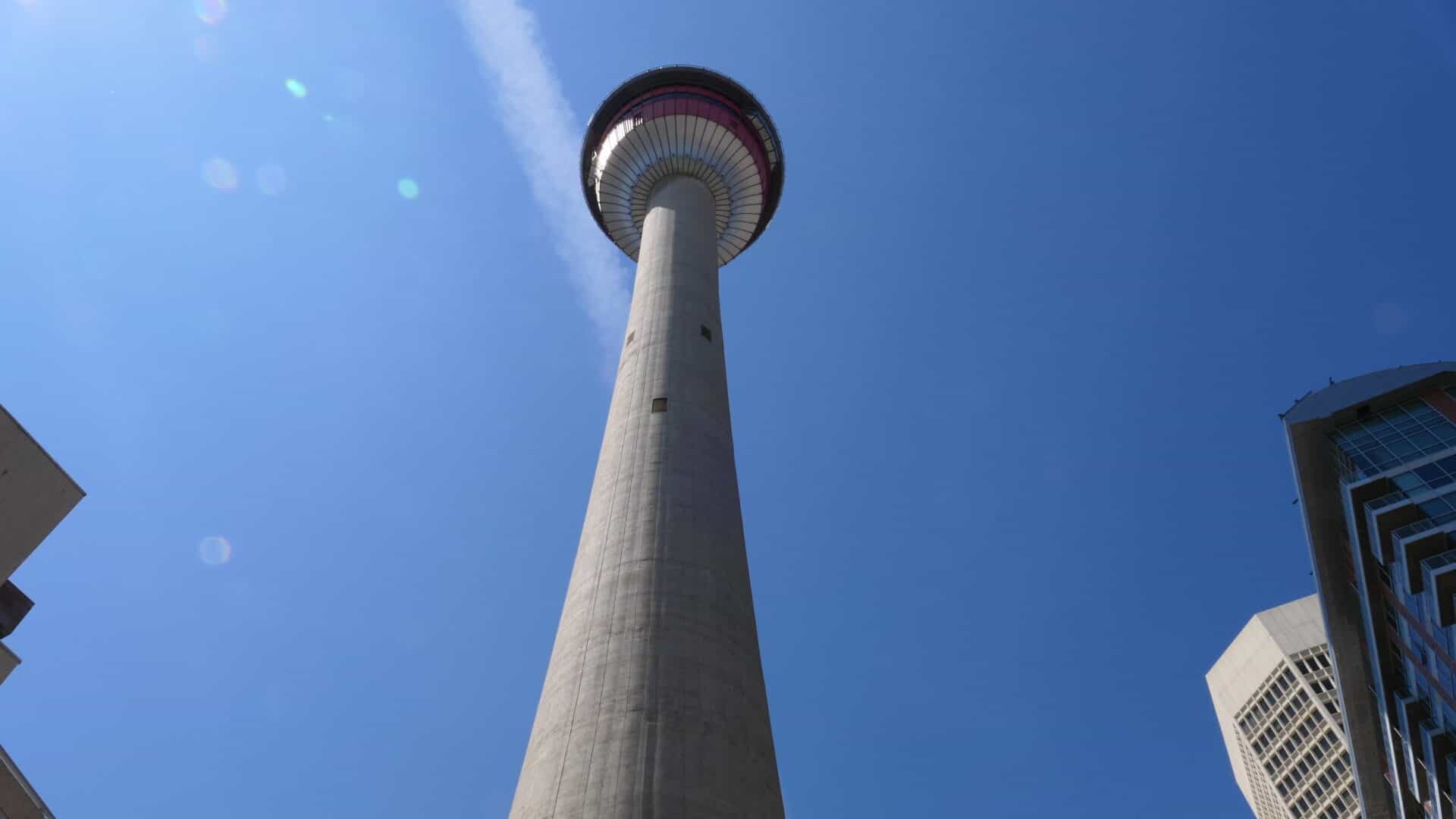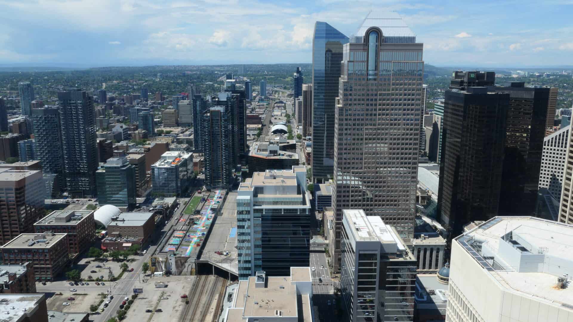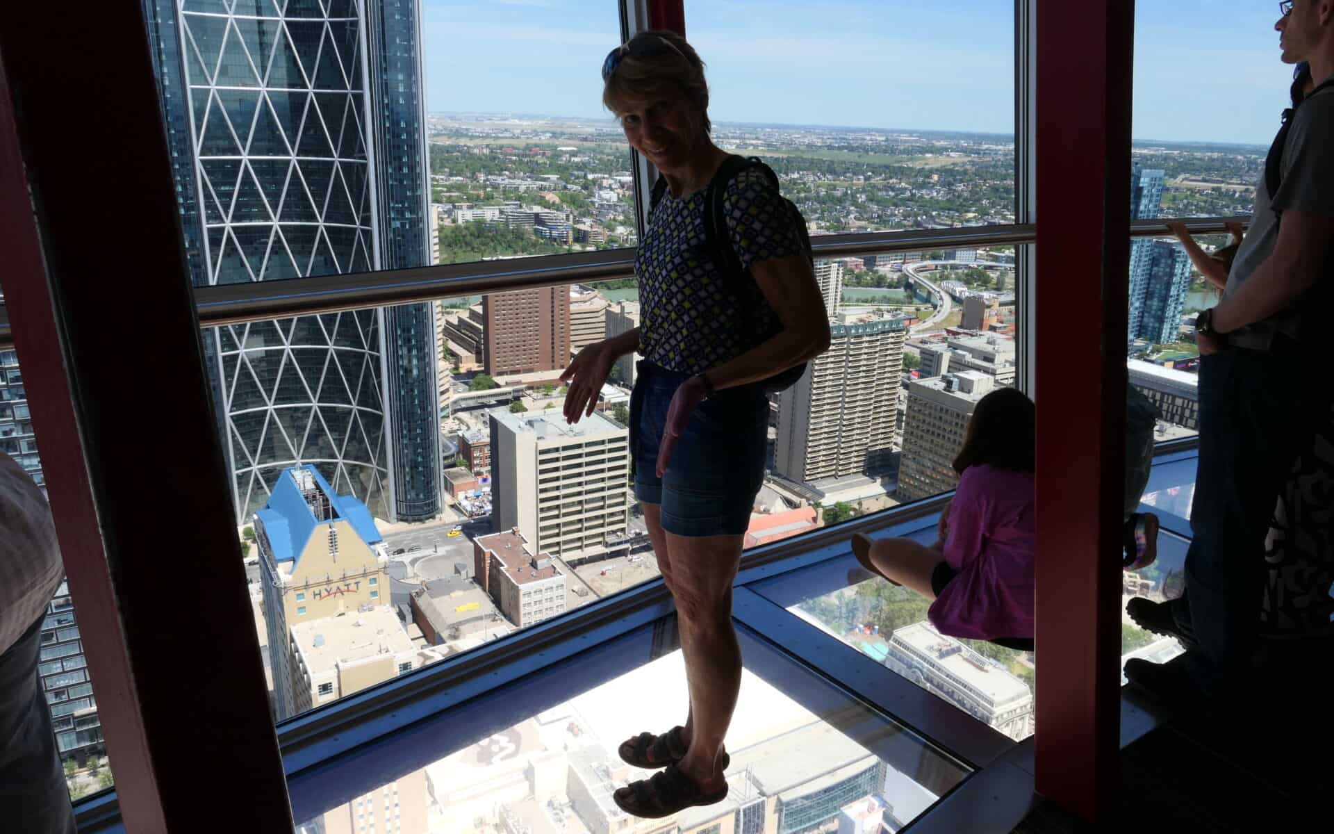 Nous avons marché dans Calgary à partir de la fameuse Tour du CN (c’est fou comme le train est omniprésent dans l’ouest) où un plancher de verre, tout en haut, permettait de voir de minuscules voitures, tout en bas… papillons dans le ventre garanti! De plus le dernier étage tout vitré permettait d’avoir une vue 360 degrés sur Calgary et ses différents points d’intérêts. Aussi, des panneaux nous donnaient différentes informations comme : la flamme olympique a brûlé au sommet de la tour lors des jeux d’hiver en 1988. Il était possible de la voir à plus de 15 kilomètres de distance.