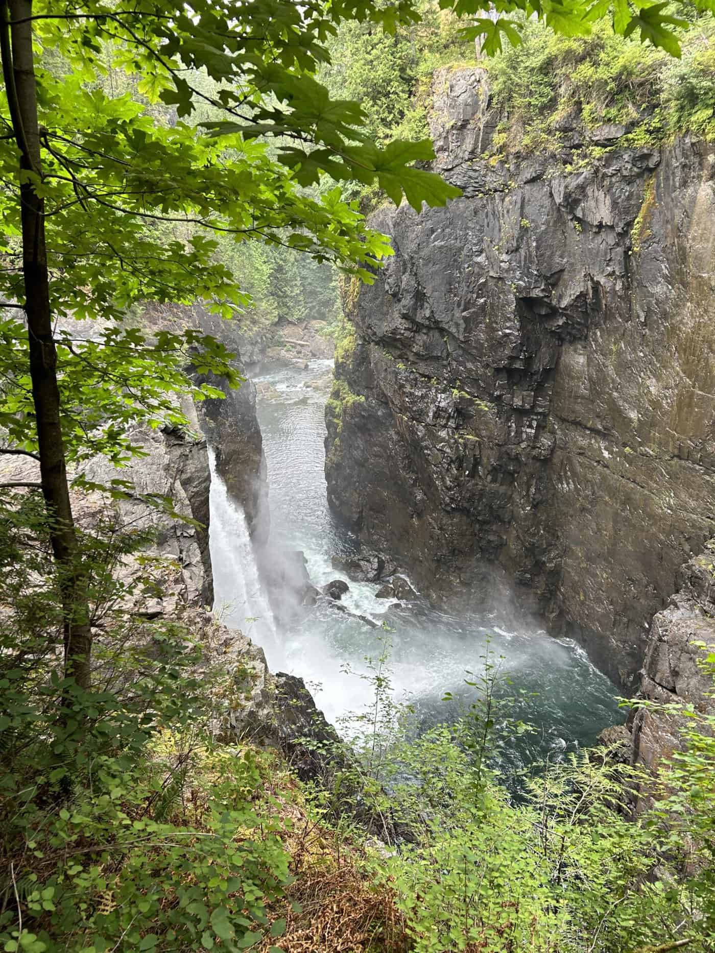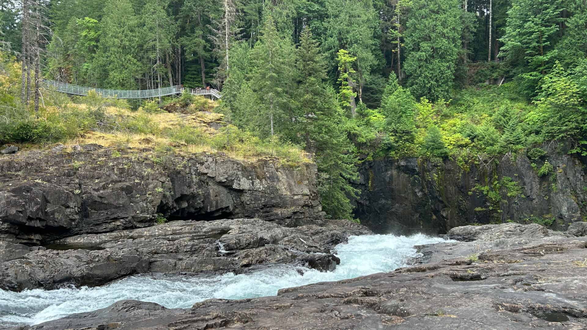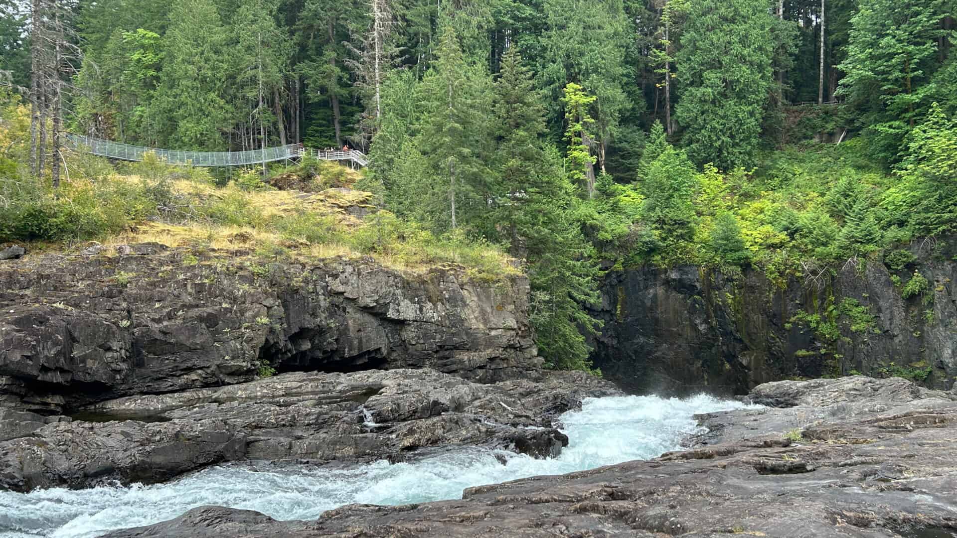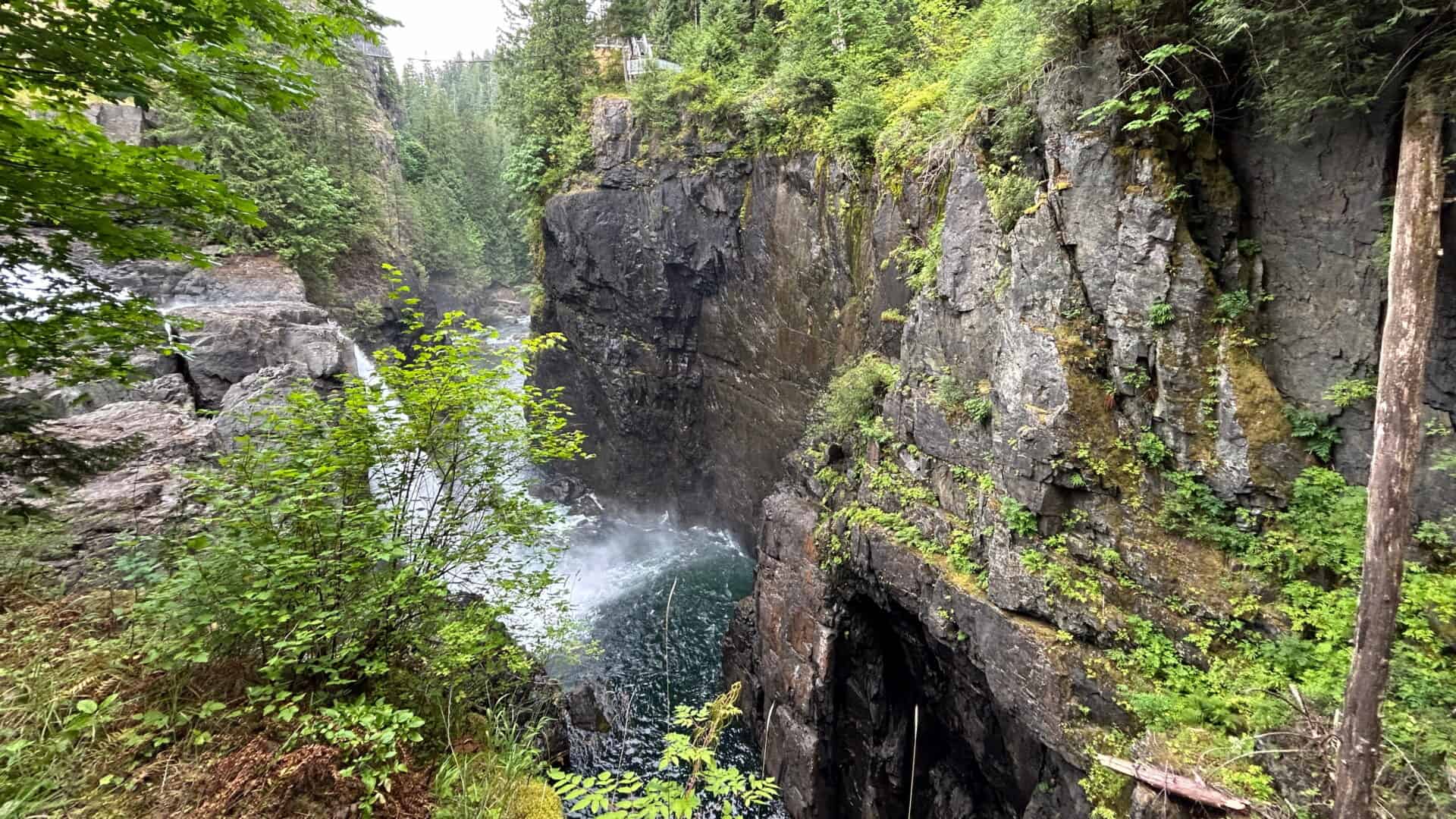 À notre dernière journée dans ce coin, nous ferons une belle randonnée qui nous fait longer la Campbell River puis traverser une forêt aux allures tropicales de par ses immenses fougères qui tapissent le sol et ses cèdres et érables géants qui nous cassent le cou quand on en cherche la cime. Cette forêt abrite la Elk Falls que l’on peut observer à trois niveaux différents. De plus, une longue passerelle suspendue en métal permet de voir la chute d’un autre angle. Avec la pluie qui débute, elle devient très glissante et me fait faire une figure de style qui me vaut une note de 8.5 de la part de Denis, car bien récupérée!