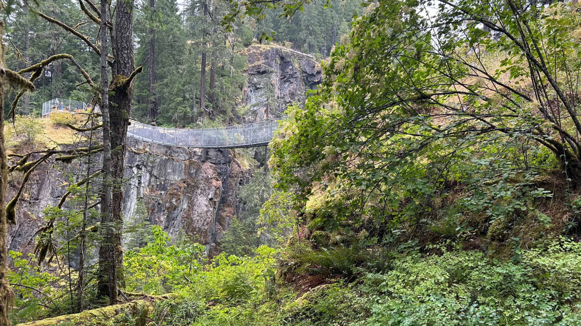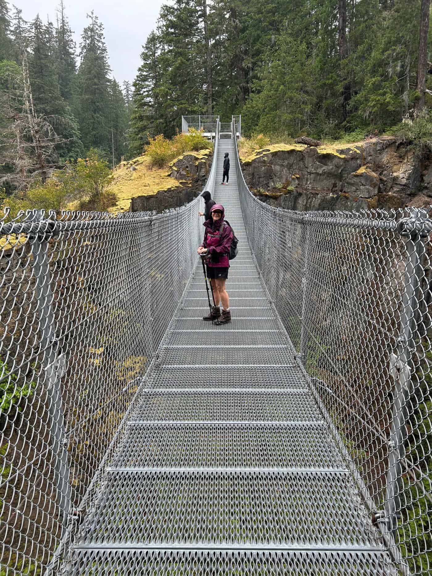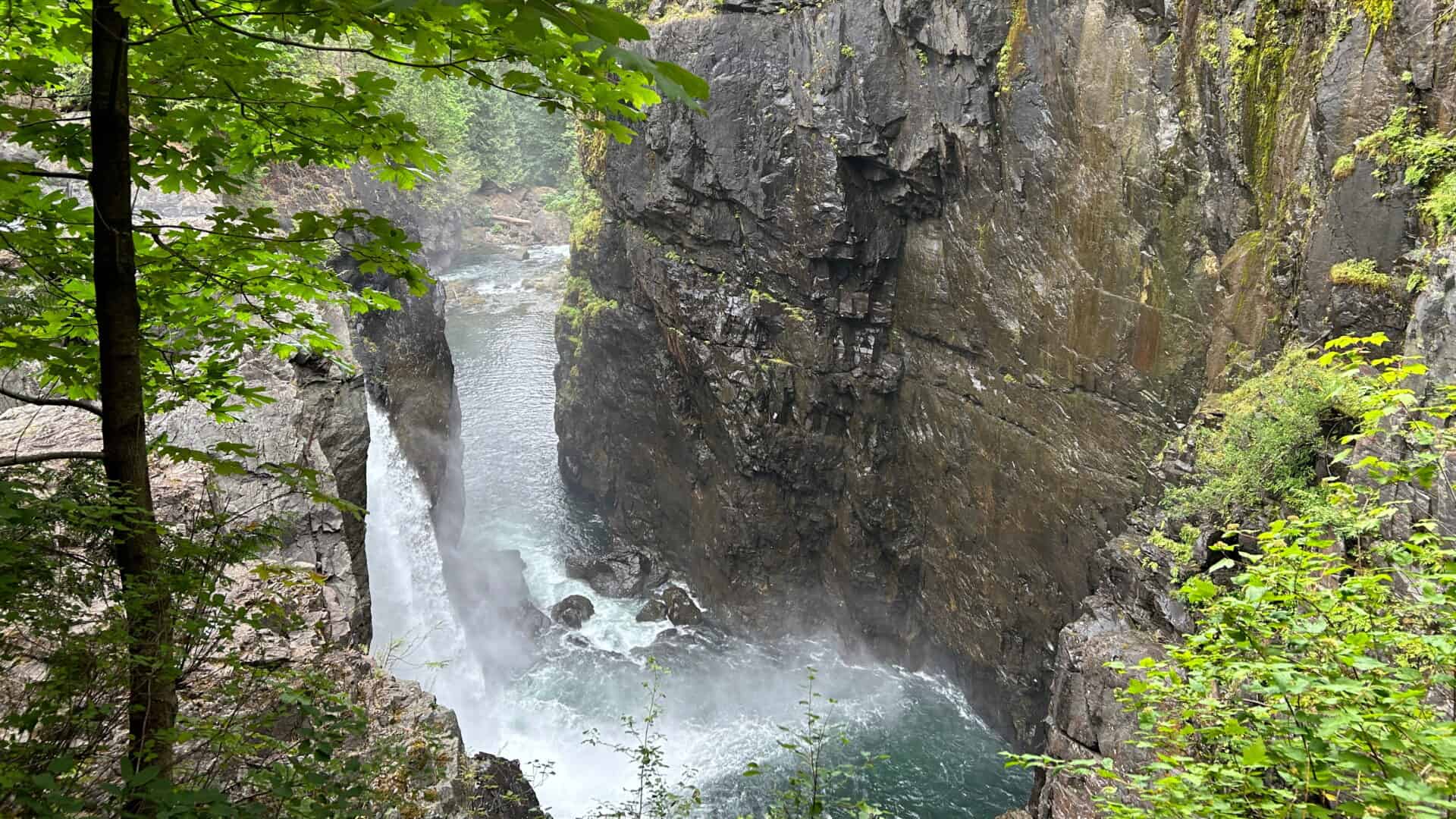 À notre dernière journée dans ce coin, nous ferons une belle randonnée qui nous fait longer la Campbell River puis traverser une forêt aux allures tropicales de par ses immenses fougères qui tapissent le sol et ses cèdres et érables géants qui nous cassent le cou quand on en cherche la cime. Cette forêt abrite la Elk Falls que l’on peut observer à trois niveaux différents. De plus, une longue passerelle suspendue en métal permet de voir la chute d’un autre angle. Avec la pluie qui débute, elle devient très glissante et me fait faire une figure de style qui me vaut une note de 8.5 de la part de Denis, car bien récupérée!