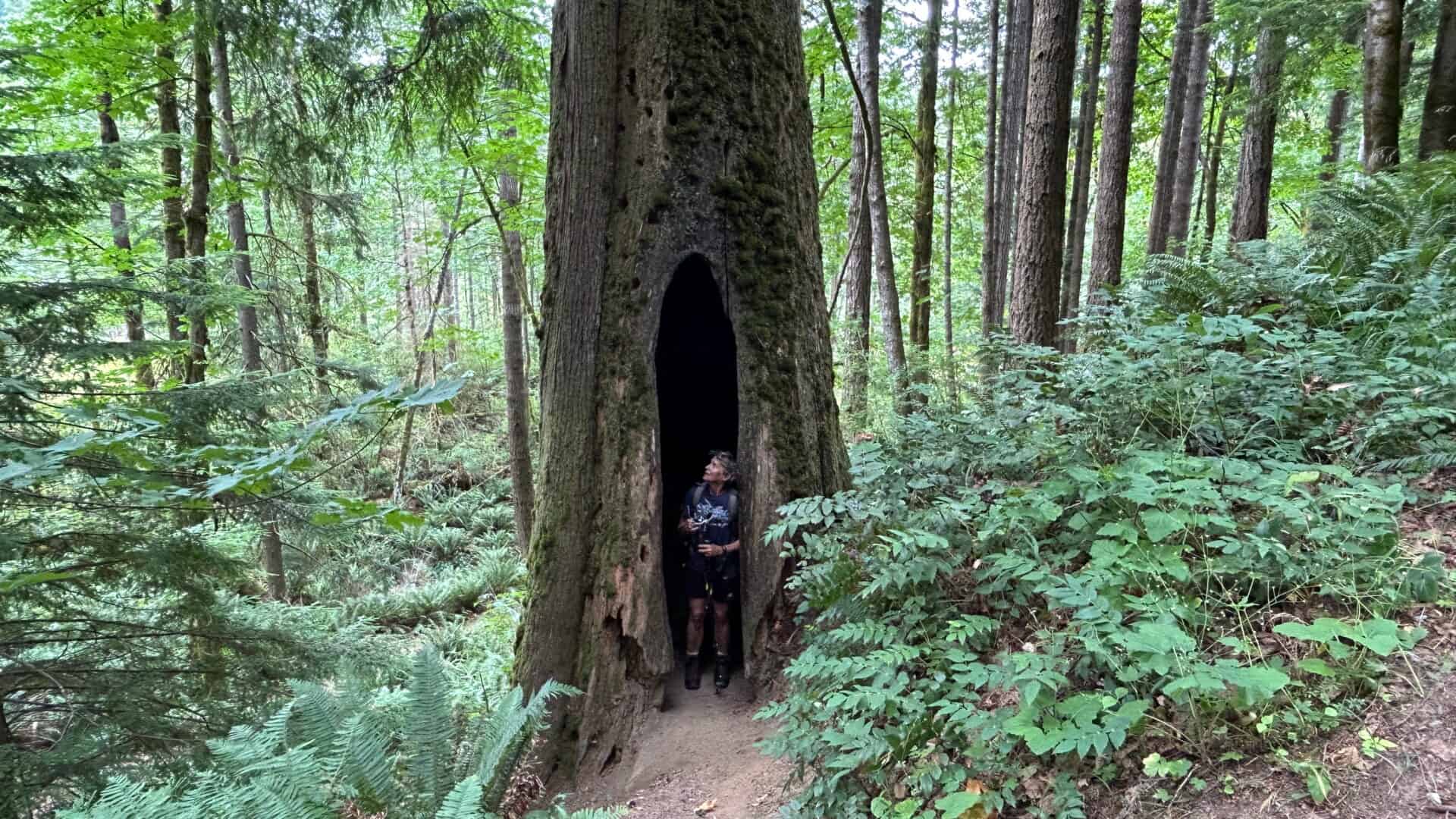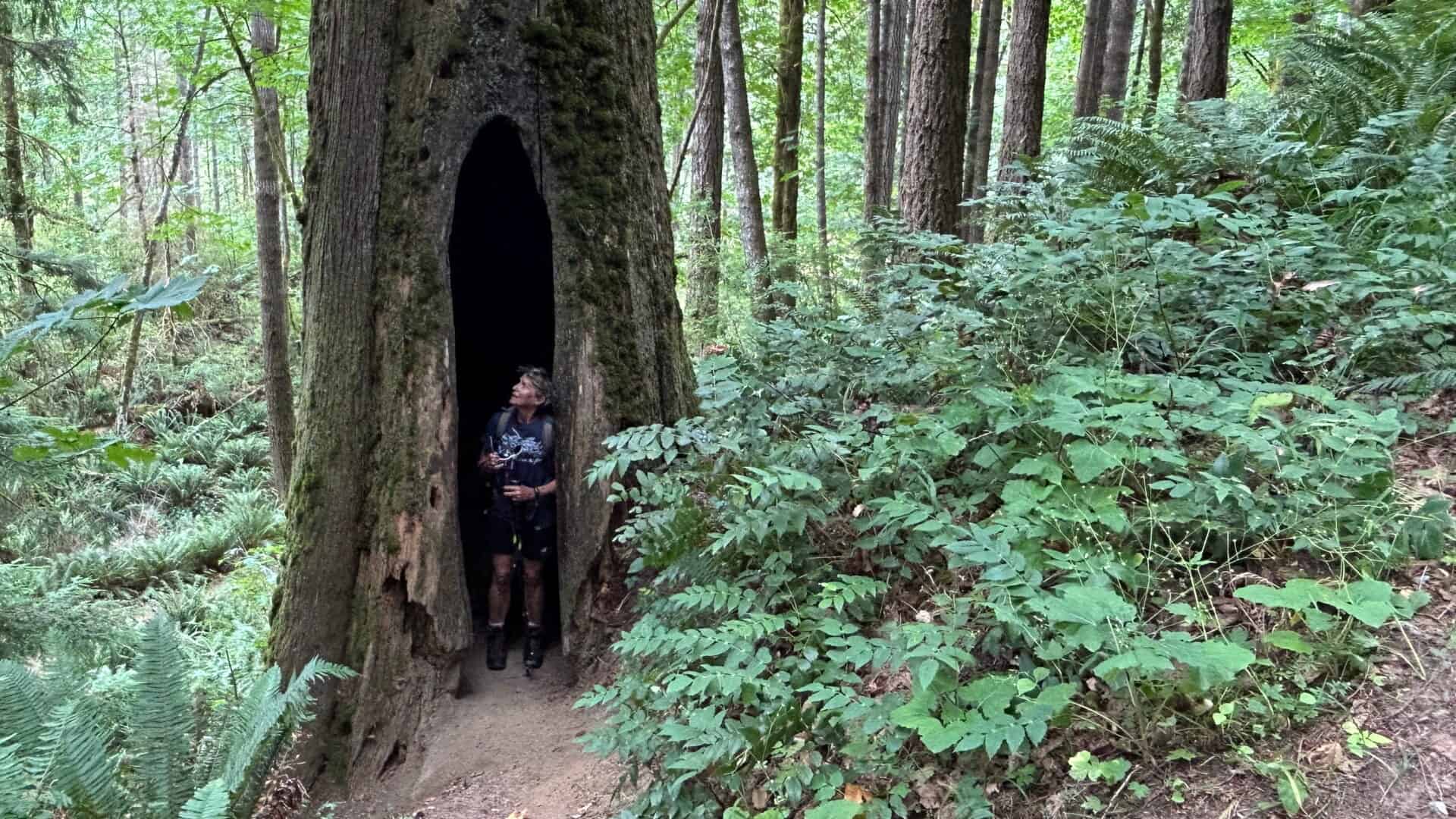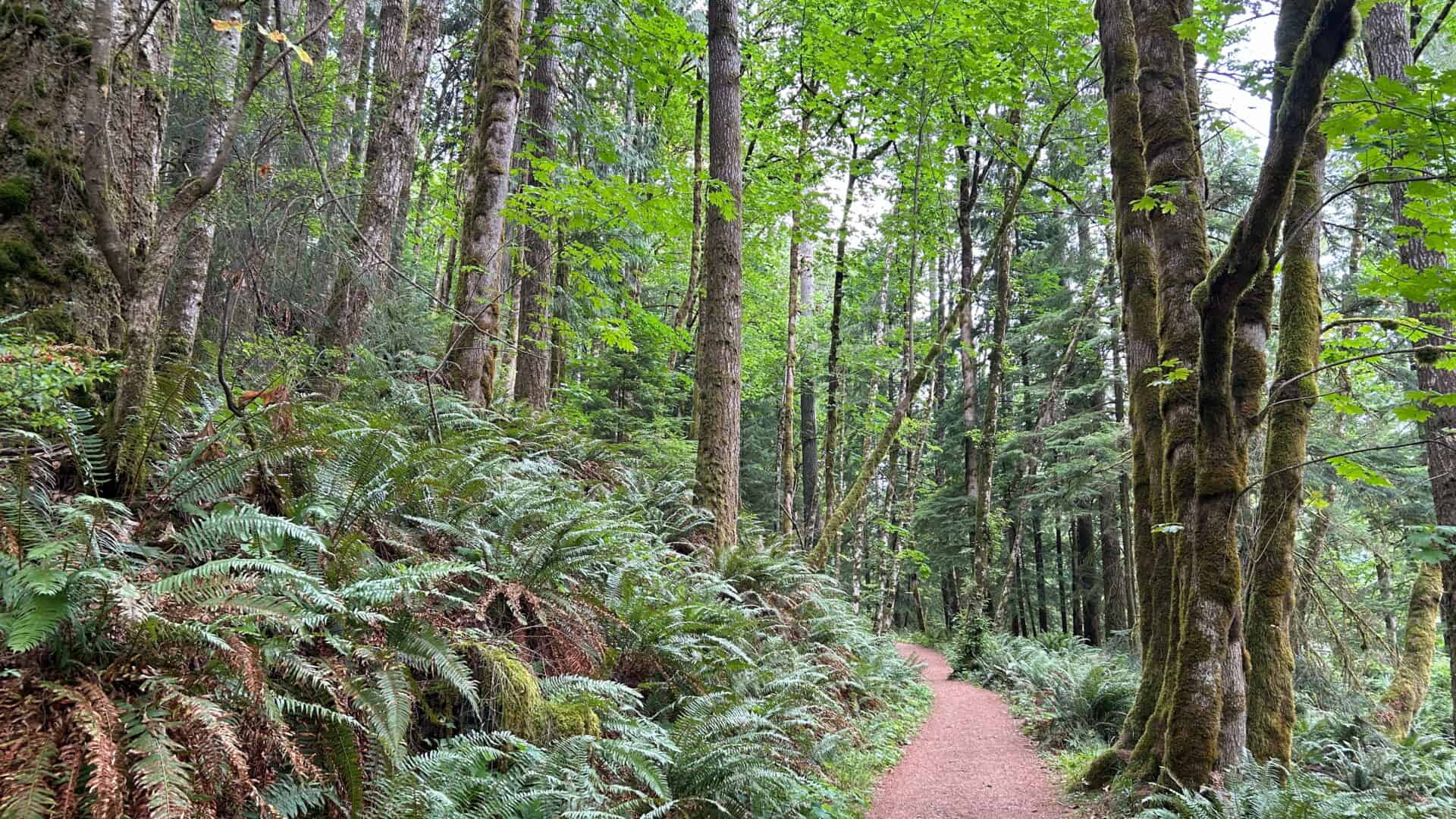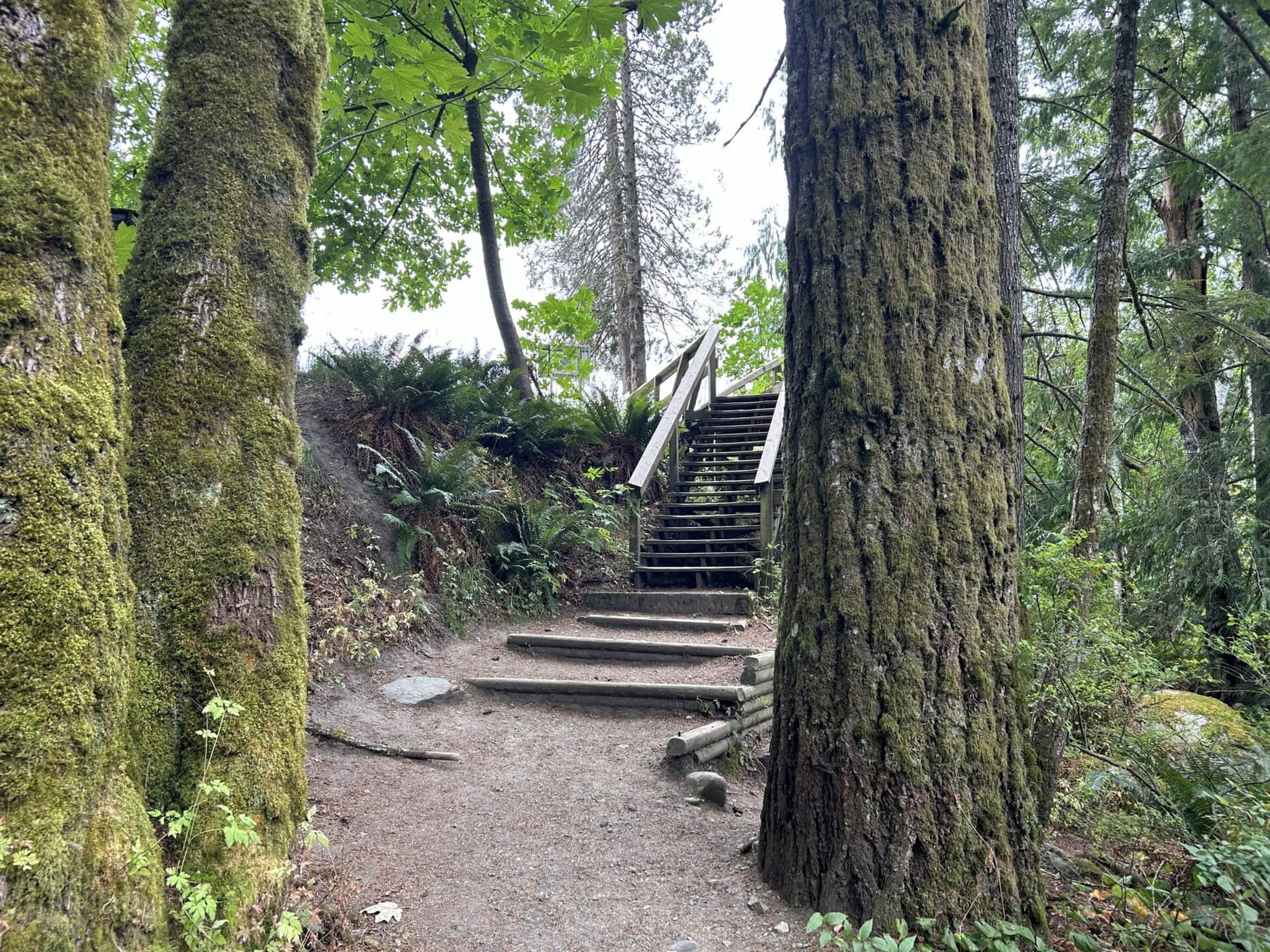 À notre dernière journée dans ce coin, nous ferons une belle randonnée qui nous fait longer la Campbell River puis traverser une forêt aux allures tropicales de par ses immenses fougères qui tapissent le sol et ses cèdres et érables géants qui nous cassent le cou quand on en cherche la cime. Cette forêt abrite la Elk Falls que l’on peut observer à trois niveaux différents. De plus, une longue passerelle suspendue en métal permet de voir la chute d’un autre angle. Avec la pluie qui débute, elle devient très glissante et me fait faire une figure de style qui me vaut une note de 8.5 de la part de Denis, car bien récupérée!
