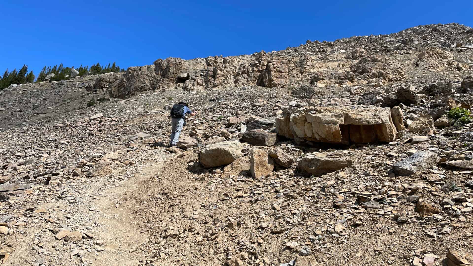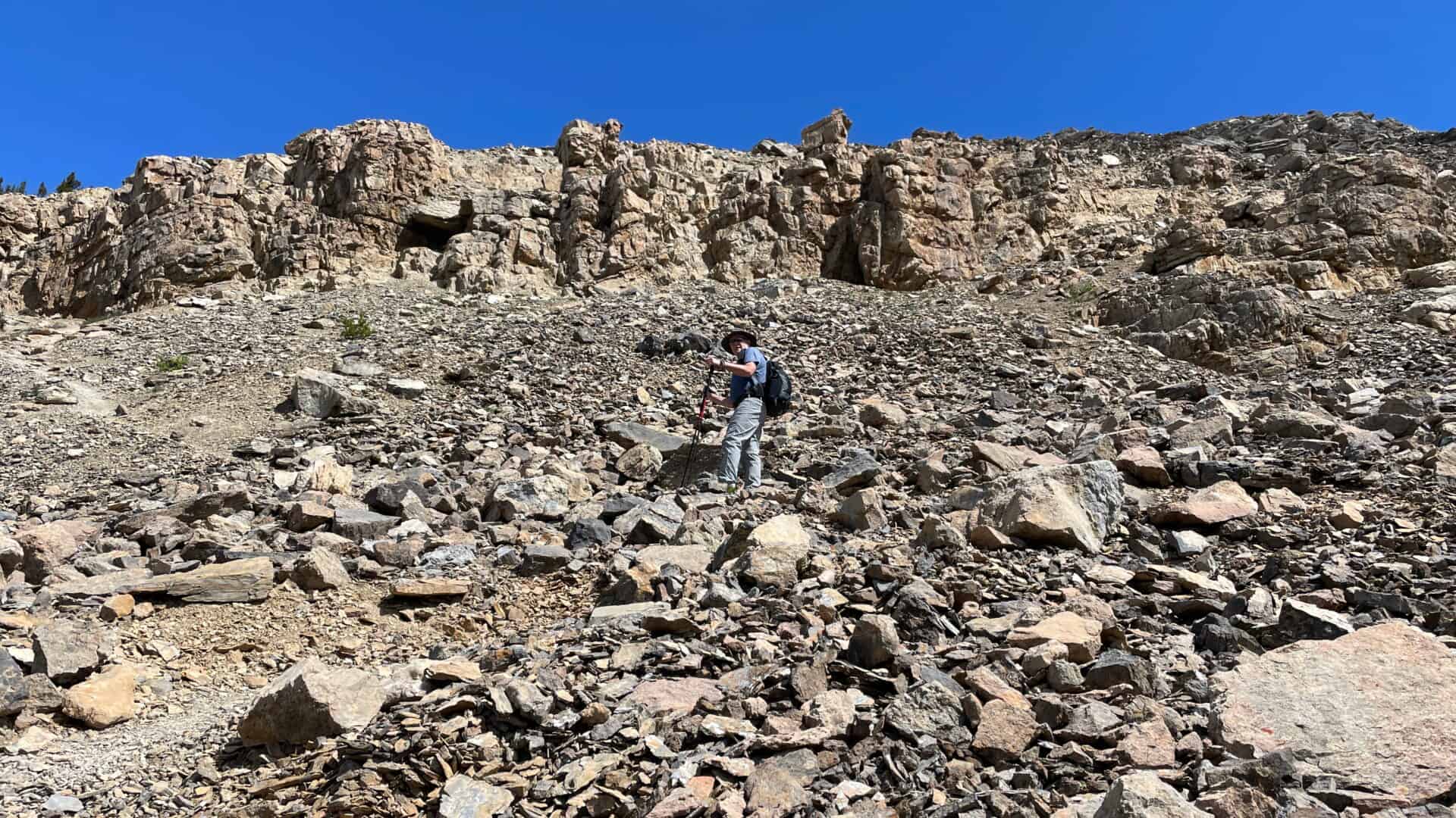 Du belvédère, il était aussi possible d’apercevoir ce que nous croyions être le sommet et qui ne semblait pas très loin. Hum la tentation est forte! Puis Josée dit à son conjoint, “nous y sommes presque, pourquoi ne pas se rendre au sommet?”. Il n’en fallait pas moins pour nous motiver à nous y rendre nous aussi. À partir de là, la montée n’était plus aussi facile. Il s’agissait d’une ascension à pic et soutenue parmi les rochers et des sentiers composés de gravier qui nous roulait sous les bottes. Mais nous étions lancés et rien ne pouvait maintenant nous arrêter, d’autant plus que Basile et Josée, deux personnes proches de nos âges, étaient devant et continuaient vers le sommet. Ouf! Quelle montée, mais comment sera la descente?