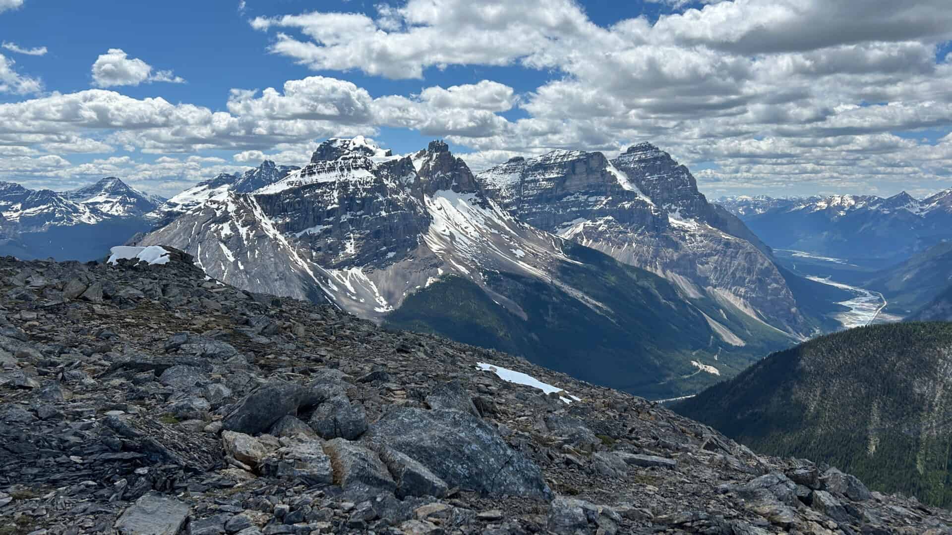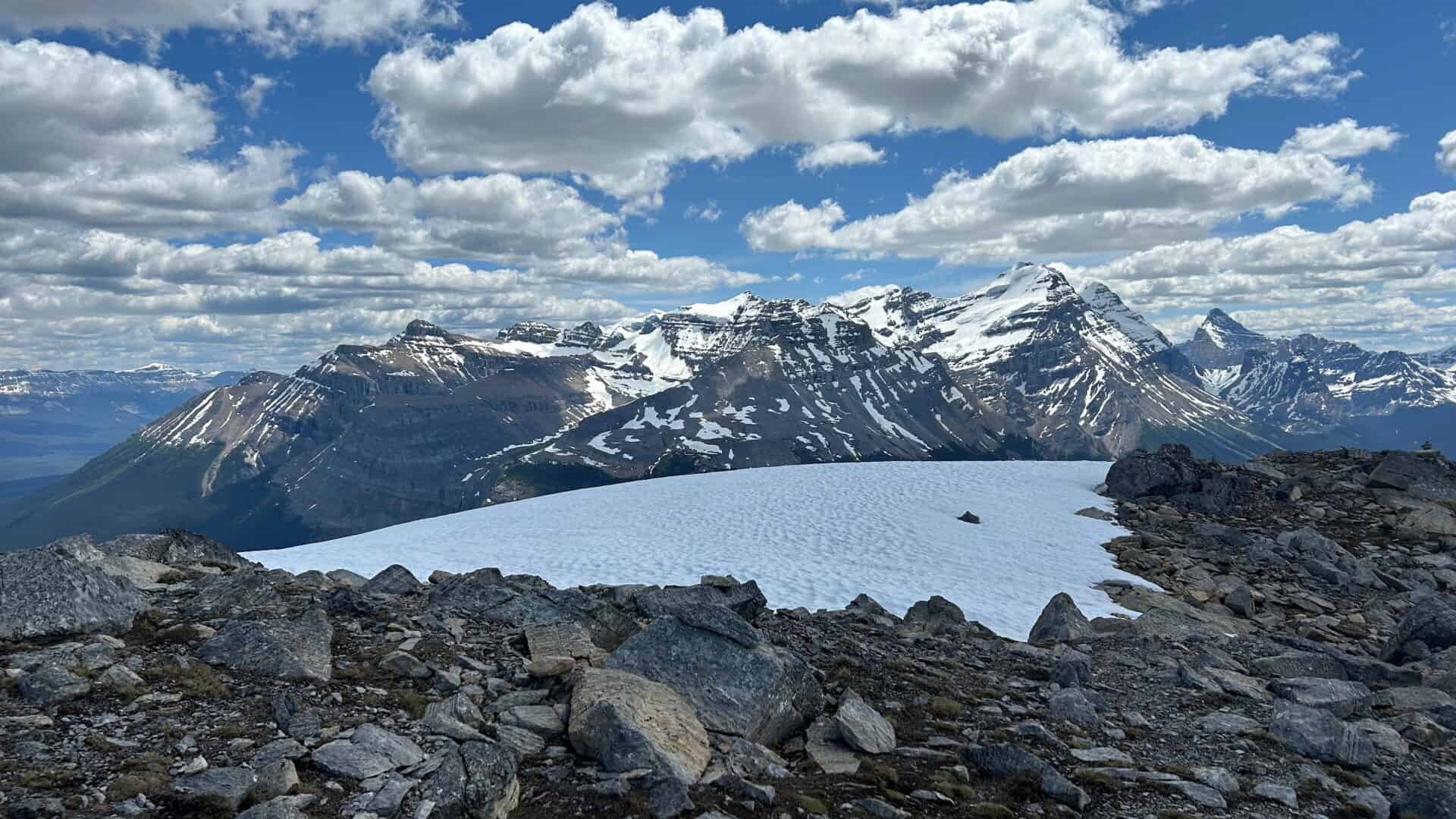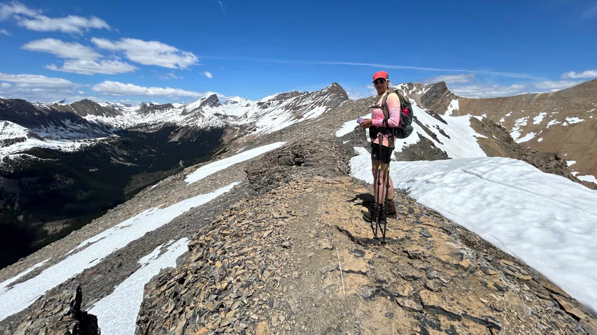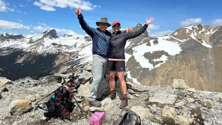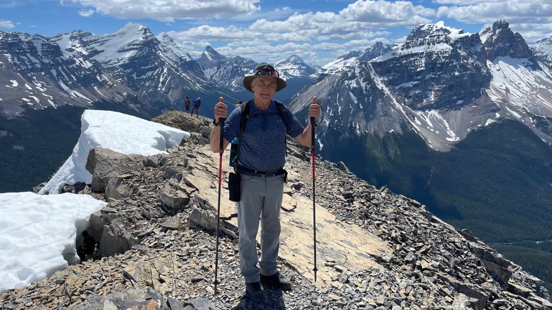 Nous rejoignons nos deux nouveaux amis qui prenaient une pause lunch un peu avant le sommet et les dépassons. Nous prendrons notre lunch au sommet, car nous avons trop hâte d’y être. Tout à coup, quel spectacle formidable? Des montagnes à perte de vue et nous qui nous sentions comme si nous les observions à bord d’un avion tellement les vues étaient plongeantes et magnifiques. Mais non, nous étions bien au sommet de l’une de ces montagnes dont nous avions eu l’audace de gravir. Quelle fierté et quelle satisfaction nous ressentions!